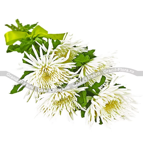 Букет из белых хризантем станет прекрасным подарком для близкого и дорогого вам человека, став красноречивым признанием в симпатии и почтении. Нежность белоснежных бутонов подчеркивается сочной темно-зеленой листвой.