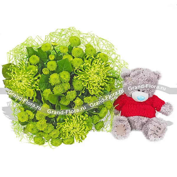 Уменьшенный: хризантема одноголовая "шамрок" зеленая - 1 шт, хризантема кустовая зеленая - 3 шт, салал, натуральная сетка - зеленая + медвежонок "Тедди" (25-30 см.).