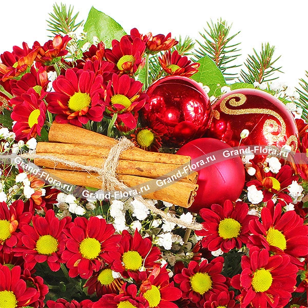 Уменьшенный: хризантема красная ромашковидная - 3шт., гипсофила - 3шт., еловая ветвь, корица, новогодний декор и зелень, сетка.