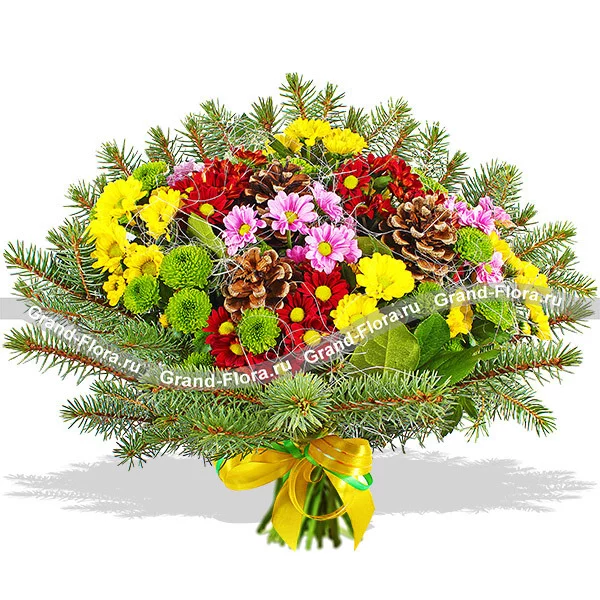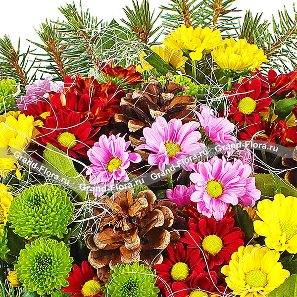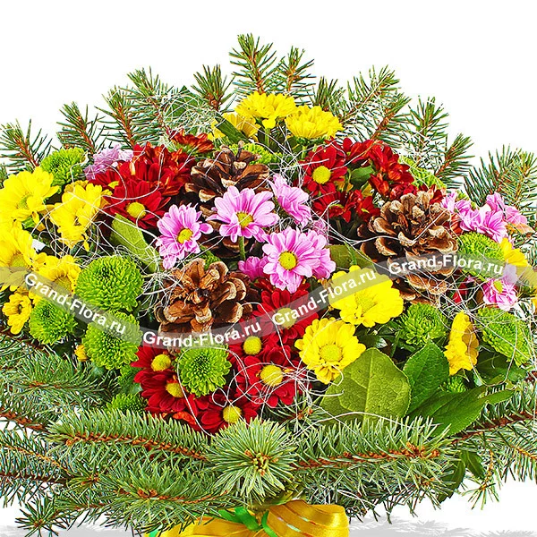 Стандартный (на фото): хризантема желтая ромашковидная - 3 шт., хризантема розовая ромашковидная - 3 шт., хризантема зеленая (сантини) - 3 шт.,  хризантема красная ромашковидная - 3 шт., еловая ветвь, новогодний декор и зелень, сетка, бант желтый.