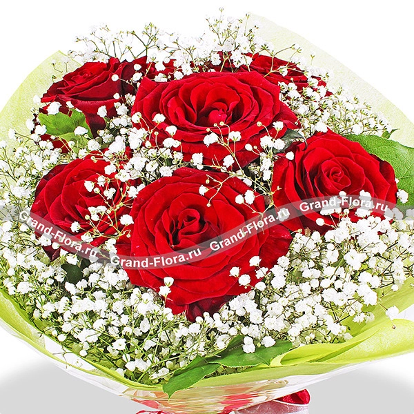 Стандартный: роза красная - 7 шт., гипсофила - 4 шт., рускус - 3 шт., фетр зеленый, бант красный.