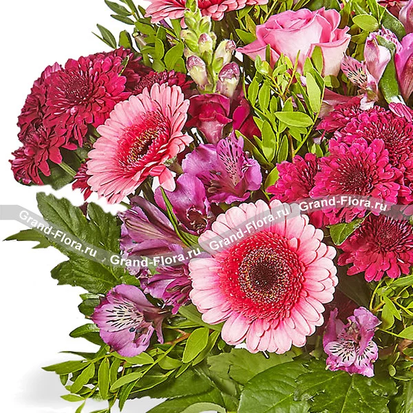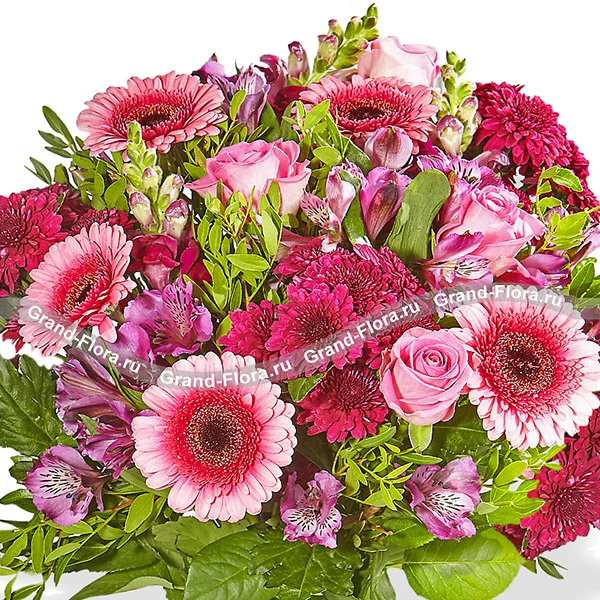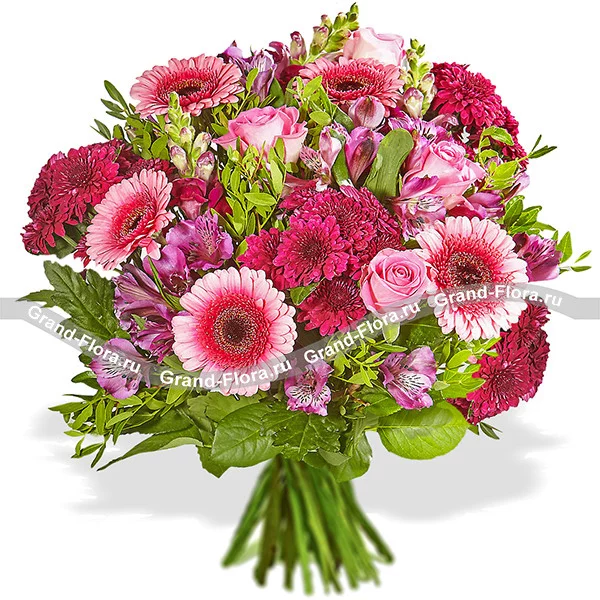 Стандартный: роза розовая - 5 шт., гербера розовая - 3 шт., альстромерия розовая - 5 шт., хризантема розовая кустовая - 3 шт., салал - 3 шт.