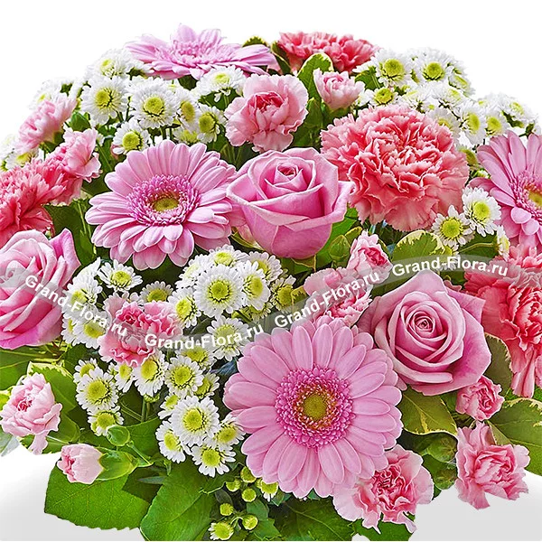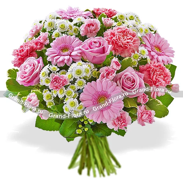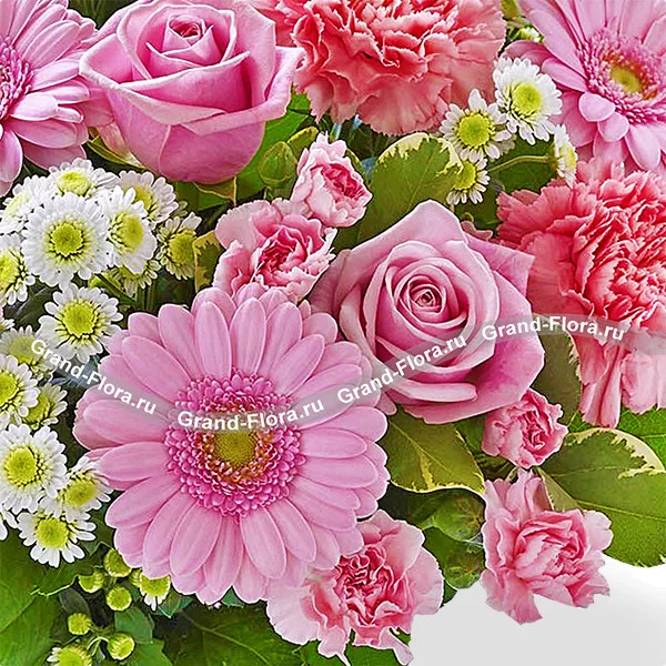 Роза Аква - 9 шт., гербера розовая - 5 шт., гвоздика розовая - 5 шт., гвоздика розовая кустовая - 5 шт., хризантема белая кустовая ромашковидная - 5 шт., салал - 4 шт.