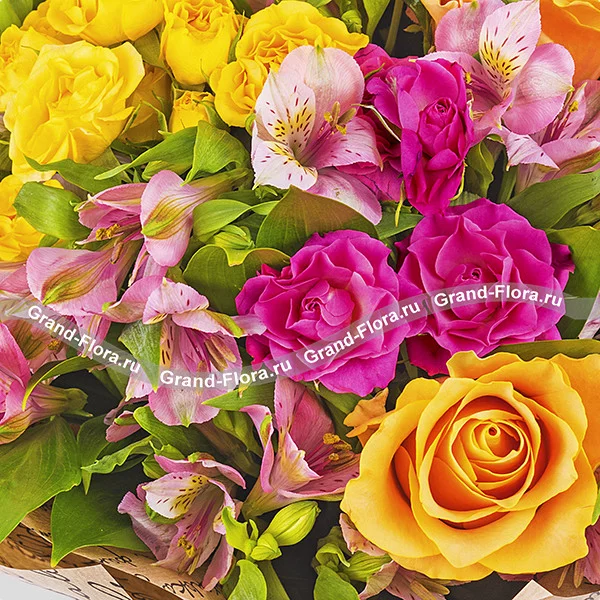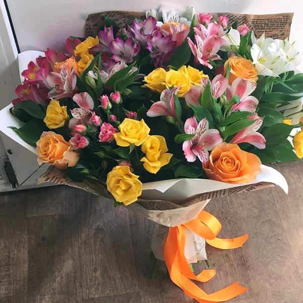 Стандартный: оранжевая роза - 3 шт, кустовая розовая роза - 2 шт, альстромерия розовая - 5 шт,