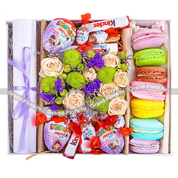 Оригинальное поздравление, в составе которого есть как цветы, так и сладости: роза кустовая белая  и хризантема кустовая зелёная, вместе, создают неповторимый и стильный дуэт на оазисе, который будет радовать дольше обычного букета, милые акценты статицы отлично дополняют всю композицию в целом. Сладкие макаруны и целая коллекция продукции киндер, несомненно не оставят равнодушным ни одного сладкоежку, а эффектной завершающей нотой станет послание в письме, текст которого Вы сможете составить сами! Обращаем Ваше внимание, что состав и оформление может отличаться.