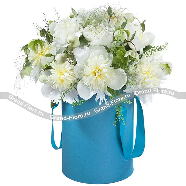 Стандартный: пион белый - 15 шт., декоративная зелень, оазис, коробка.