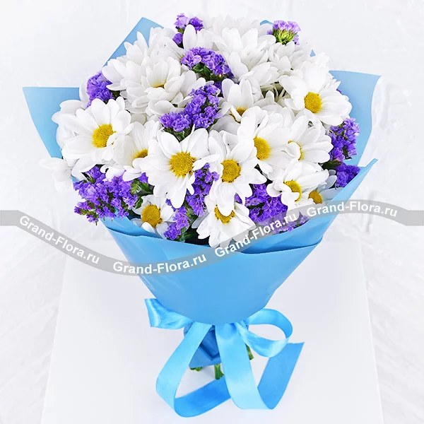 Стандартный (на фото): хризантема белая кустовая ромашковая - 7 ., статица - 3 шт., салал, фетр фиолетовый.